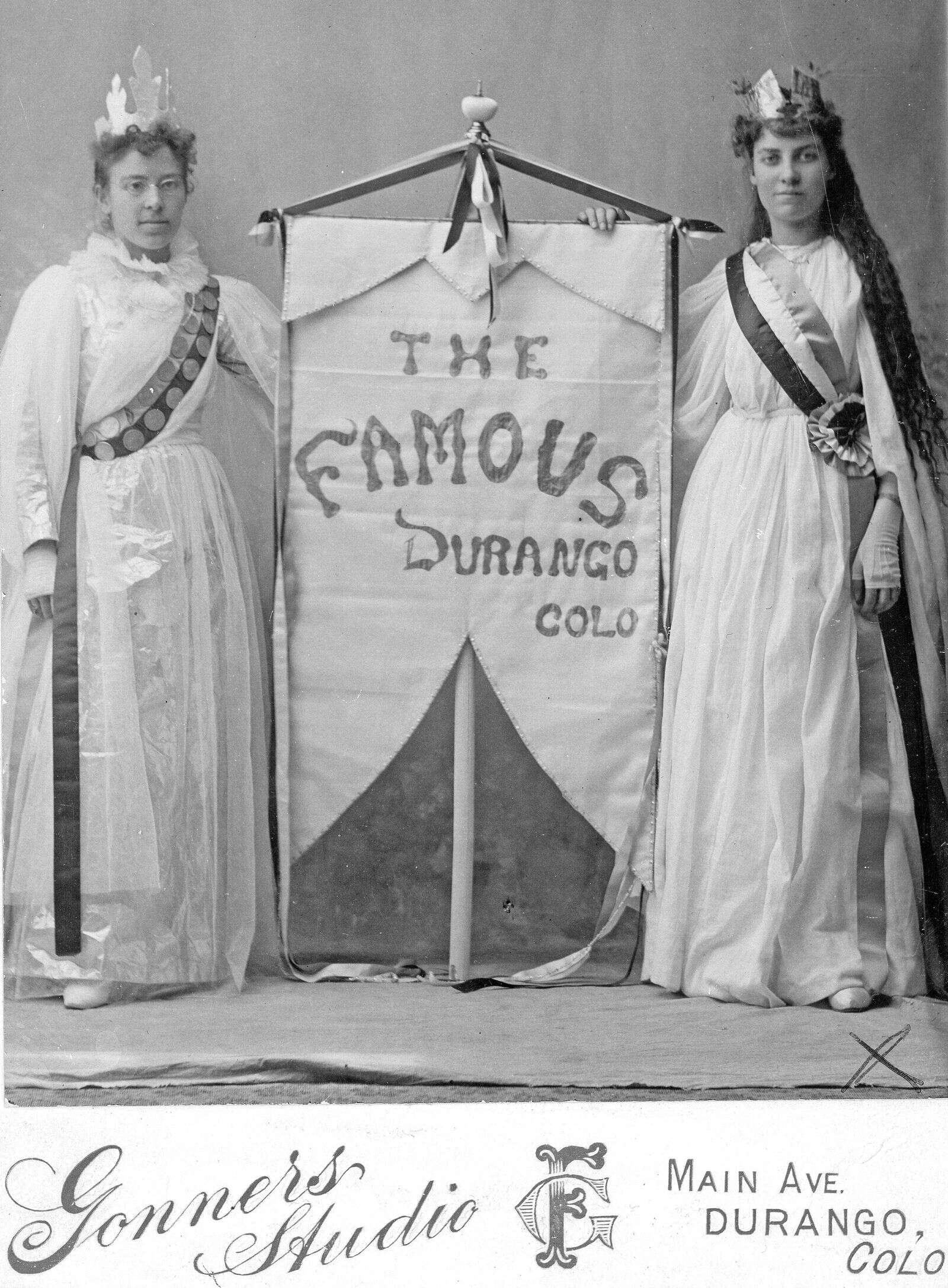 Among the historical artifacts from this period is a striking advertising photograph from around 1897. This image features Marie Burch, who is identified as the woman on the right. That same year, she married August Klahn at St. Columba Catholic Church, a significant venue in Durango’s history. Klahn’s journey in Durango began when he arrived as a young boy in 1880, marking the start of a long-lasting connection to the area.