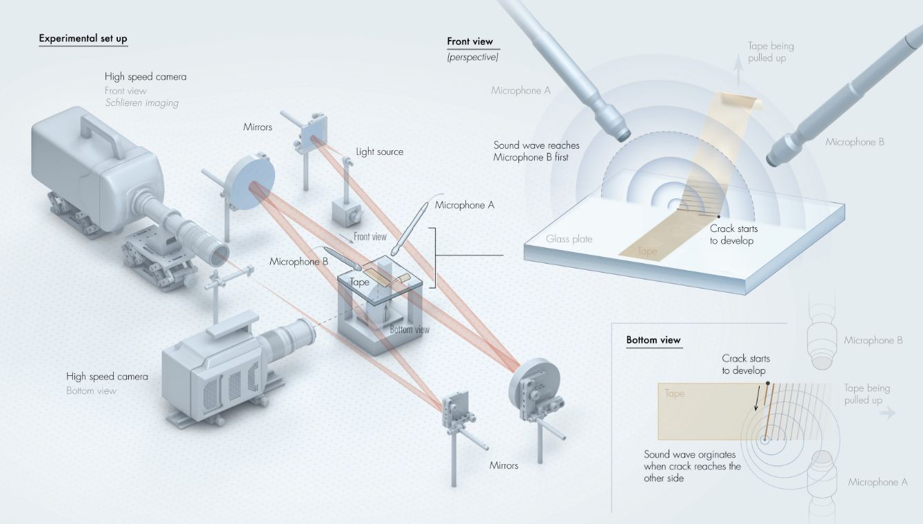 The research team discovered that as the tape is pulled away, transverse fractures form after a prolonged sticking phase. These fractures create a vacuum that instantly collapses at the end of the slip phase, generating a pressure of 9600 Pa. This sudden release produces the loud sounds often associated with peeling tape, which can be heard across a room or an open-plan office.
