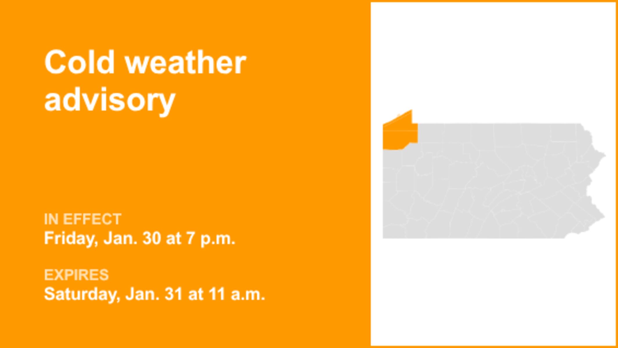 URGENT UPDATE: A cold weather advisory has just been issued for residents of Northwest Pennsylvania, lasting from 7 p.m. today until 11 a.m. Saturday. The National Weather Service warns of dangerously low wind chills, potentially plummeting to a staggering -21°F, particularly affecting Northern and Southern Erie as well as Crawford County.
